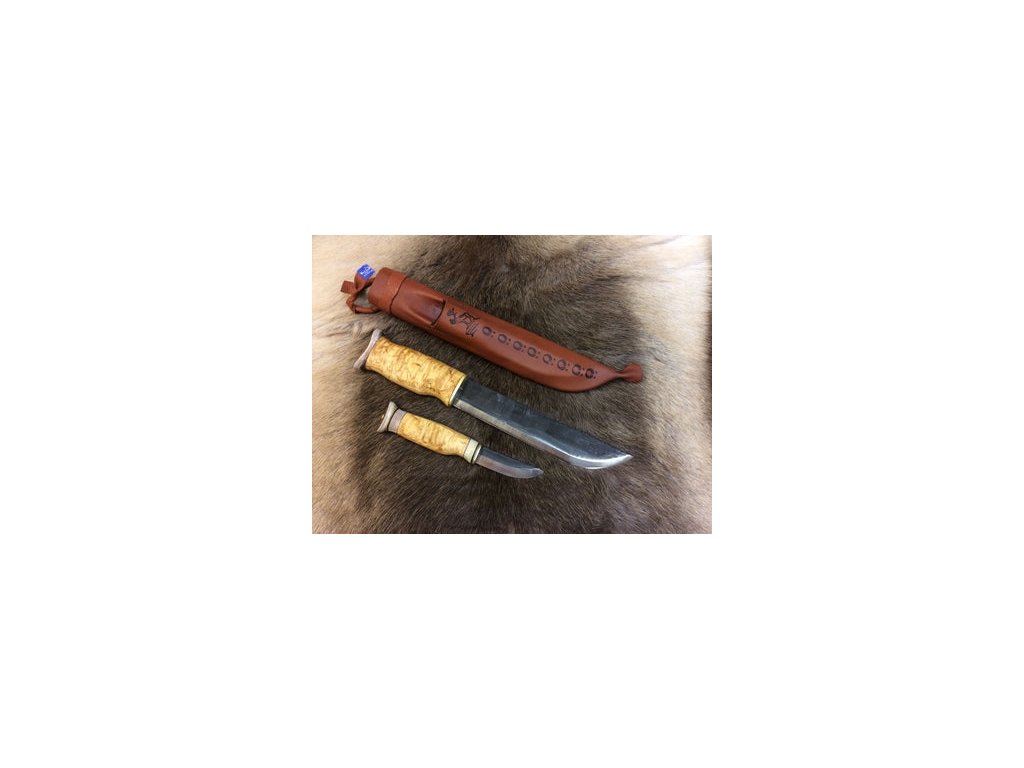 Finský nůž s pevnou čepelí 21cm, rukojeť ze sobího parohu/rakytníkového dřeva a řezbářský nůž s čepelí 7,7 cm ve stejné pochvě, pochva se zvířecím vzorem.