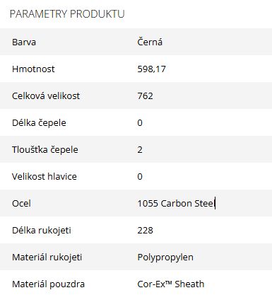 Čepel s Full tang konstrukcí je vyrobena z uhlíkové oceli 1055 s antikorozní povrchovou černou úpravou.