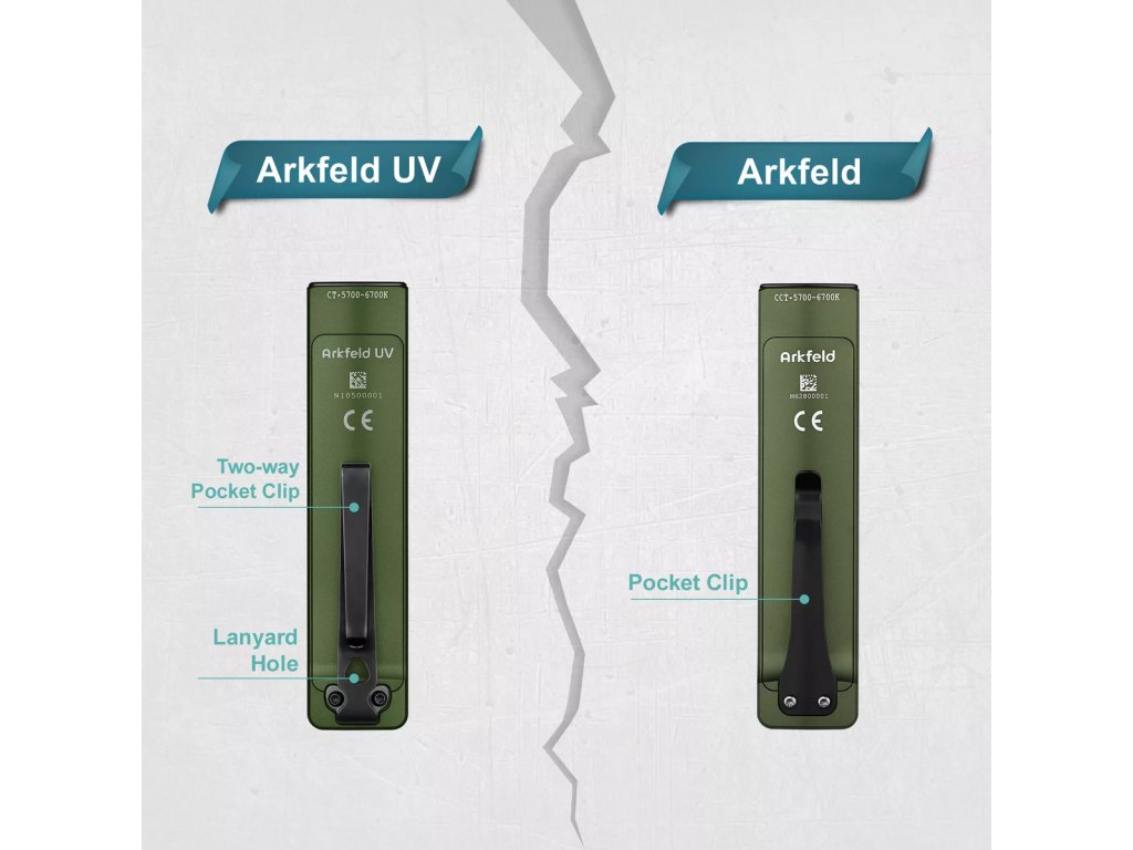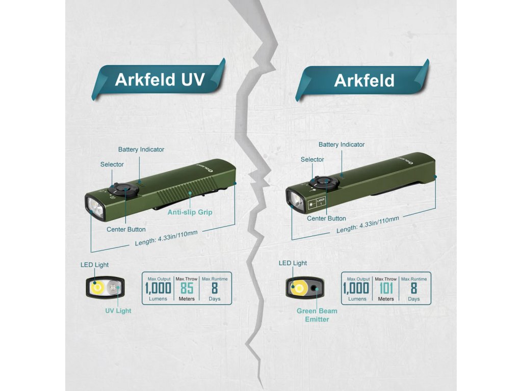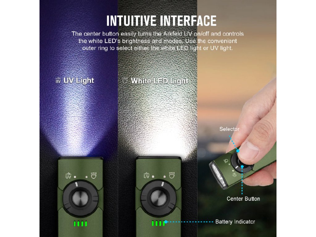 Olight Arkfeld přináší revoluční spojení bílého LED osvětlení s UV světlem do jednoho kompaktního svítidla. S pěti úrovněmi jasu a maximálním výkonem 1000 lm je tento světlomet impozantním prvkem ve svém oboru. Vestavěné UV světlo o výkonu 580 mW umožňuje vidět věci, které jsou běžným okem neviditelné, což je skvělé pro detekci různých stop nebo nedokonalostí.