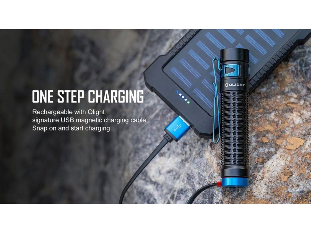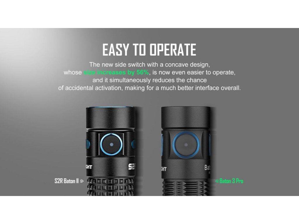 Baton 3 Pro je vybaven zvětšeným konkávním spínačem na straně, který zajišťuje příjemný kontakt a snadné ovládání. Svítilna je napájena dobíjecím li-Ion akumulátorem 18650 s kapacitou 3200 mAh, který se plně nabije za 3,5 hodiny pomocí magnetického nabíjecího USB kabelu. S plně nabitou baterií může svítilna fungovat až 120 dní.