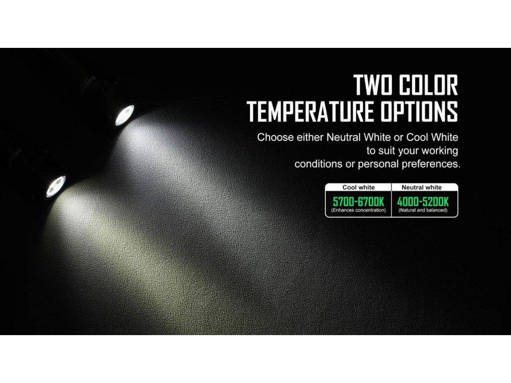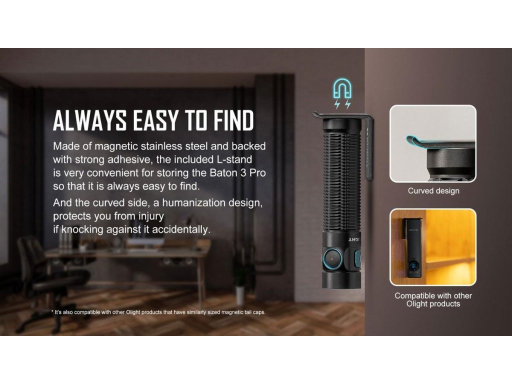 Dodávaný stojan ve tvaru L slouží k pohodlnému uložení kapesní svítilny. Baton 3 Pro je dostupná ve dvou variantách teploty barev – studená bílá a neutrální bílá – což umožňuje přizpůsobení různým požadavkům a scénářům.