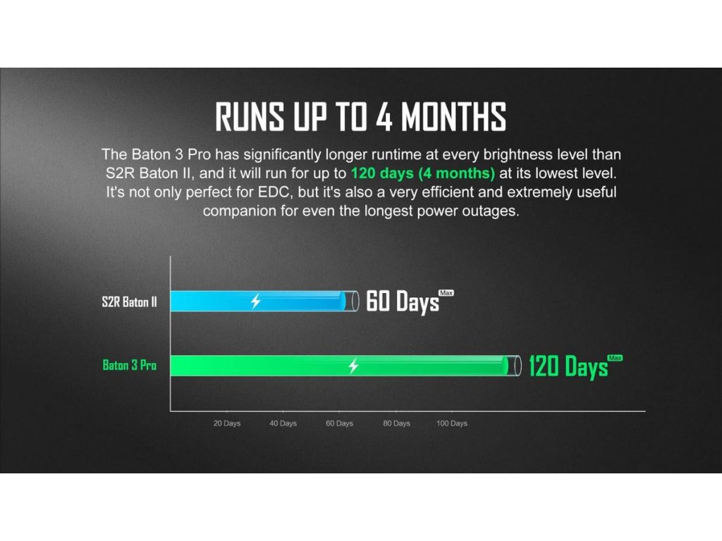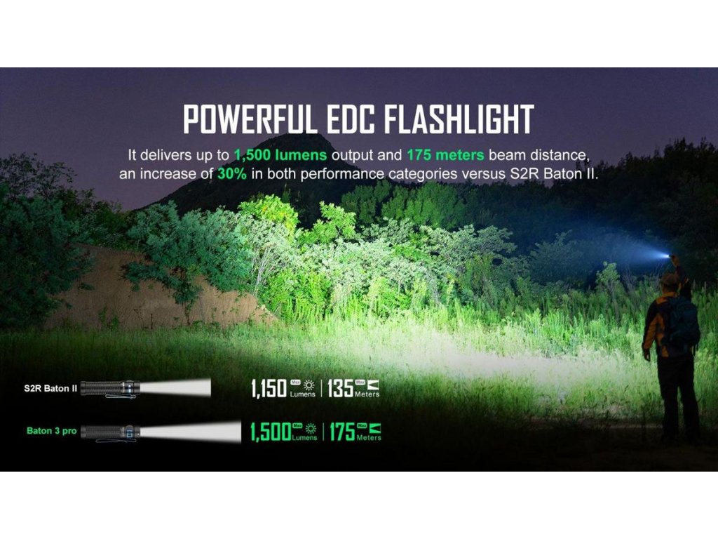 Baton 3 Pro je vylepšená verze S2R Baton II, která nabízí vyšší výkon a nové funkce. S maximálním světelným výkonem až 1 500 lumenů představuje nárůst o 30 % oproti S2R Baton II. Světelný dosah dosahuje až 175 metrů, což je ideální pro outdoorové aktivity.