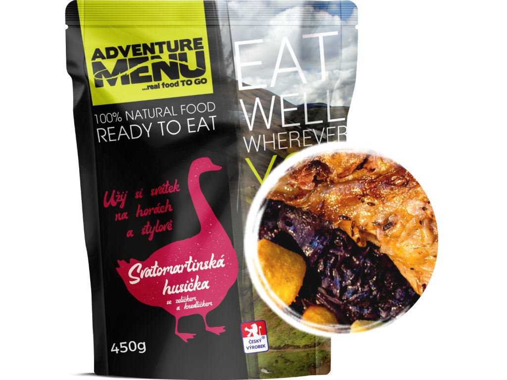 Tradice je třeba ctít, a tak se do Adventure Menu vrací limitovaná edice svatomartinské husičky se zelíčkem a knedlíčky. Základem je vykoštěné husí stehno pečené na páře, doplněno o ručně dělané červené zelíčko a špalíčky z bramborového těsta. Porce 450 g zajistí, že už potom nic nevyjdeš, tudíž doporučujeme zvolit adekvátní trasu a místo oběda. :)